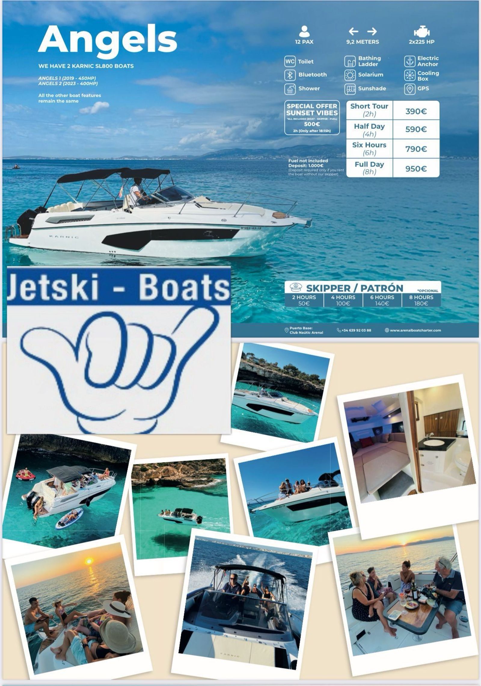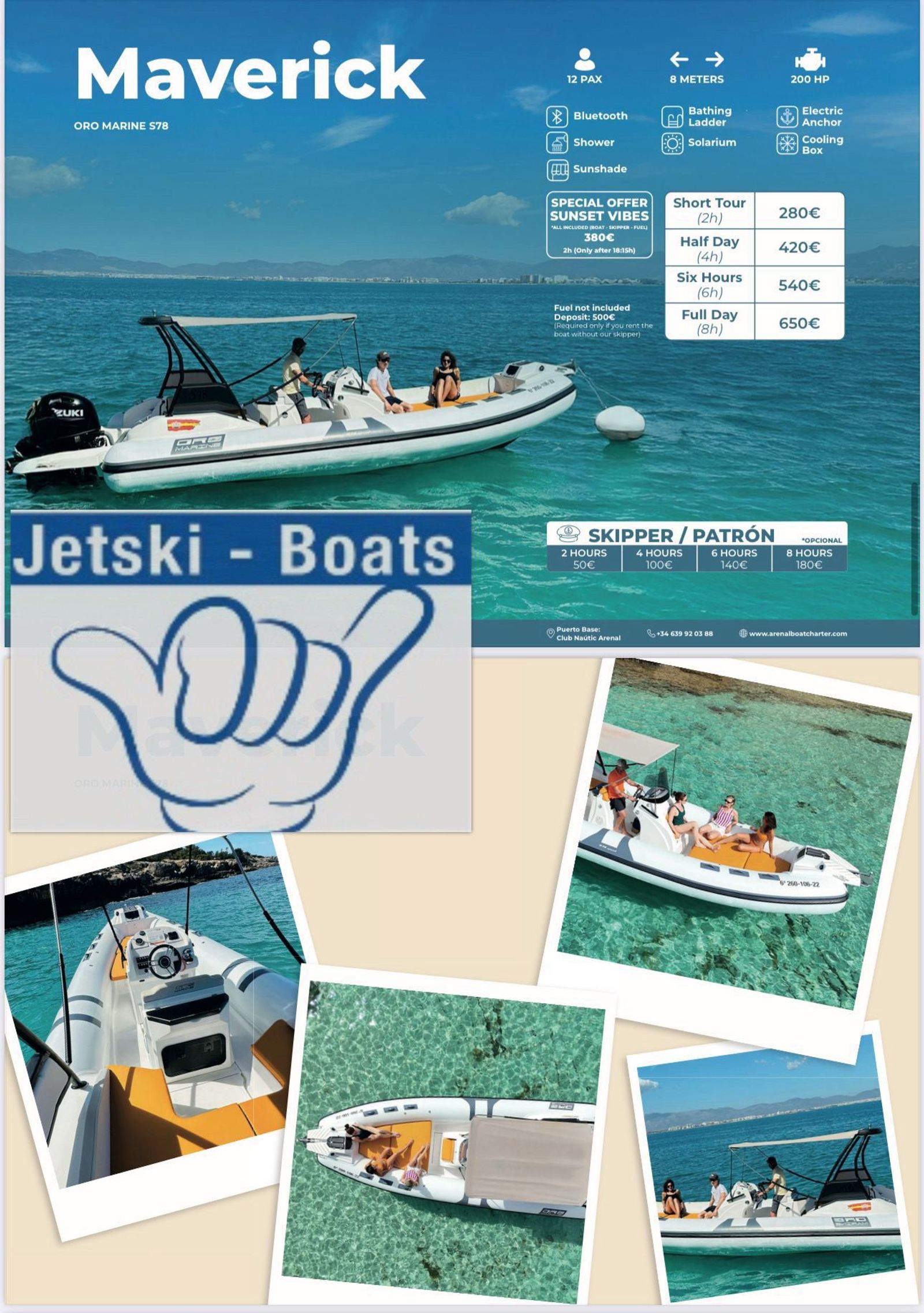 In addition to Jetskis, we also offer a selection of boats for relaxed excursions, swimming stops, and unforgettable hours on the water.